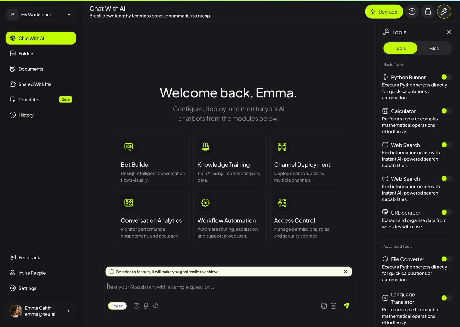 NeuAI provides the essential tools organizations need to build, train, deploy, and manage intelligent AI chatbots at scale.